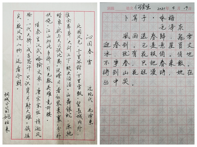童安校車開展“翰香獻(xiàn)禮,感念黨恩”紅色詩詞書寫活動(dòng)。通過書寫《卜算子·詠梅》《沁園春·雪》《七律·長征》等經(jīng)典紅色詩詞,傳承紅色基因,發(fā)揚(yáng)紅色精神。