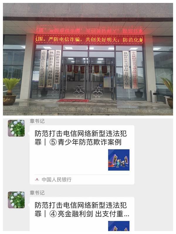 公司領(lǐng)導(dǎo)高度重視,精心組織,在公司電子屏和公交車尾電子屏循環(huán)播放宣傳標(biāo)語,在公司職工微信群轉(zhuǎn)發(fā)《致全市財(cái)務(wù)人員的一封信》、《致全體學(xué)生及家長(zhǎng)的一封信》,進(jìn)一步提高職工及廣大人民群眾對(duì)各類電信網(wǎng)絡(luò)詐騙的自我防范意識(shí),增強(qiáng)法治意識(shí),提高維權(quán)能力,切實(shí)打擊電信網(wǎng)絡(luò)詐騙。